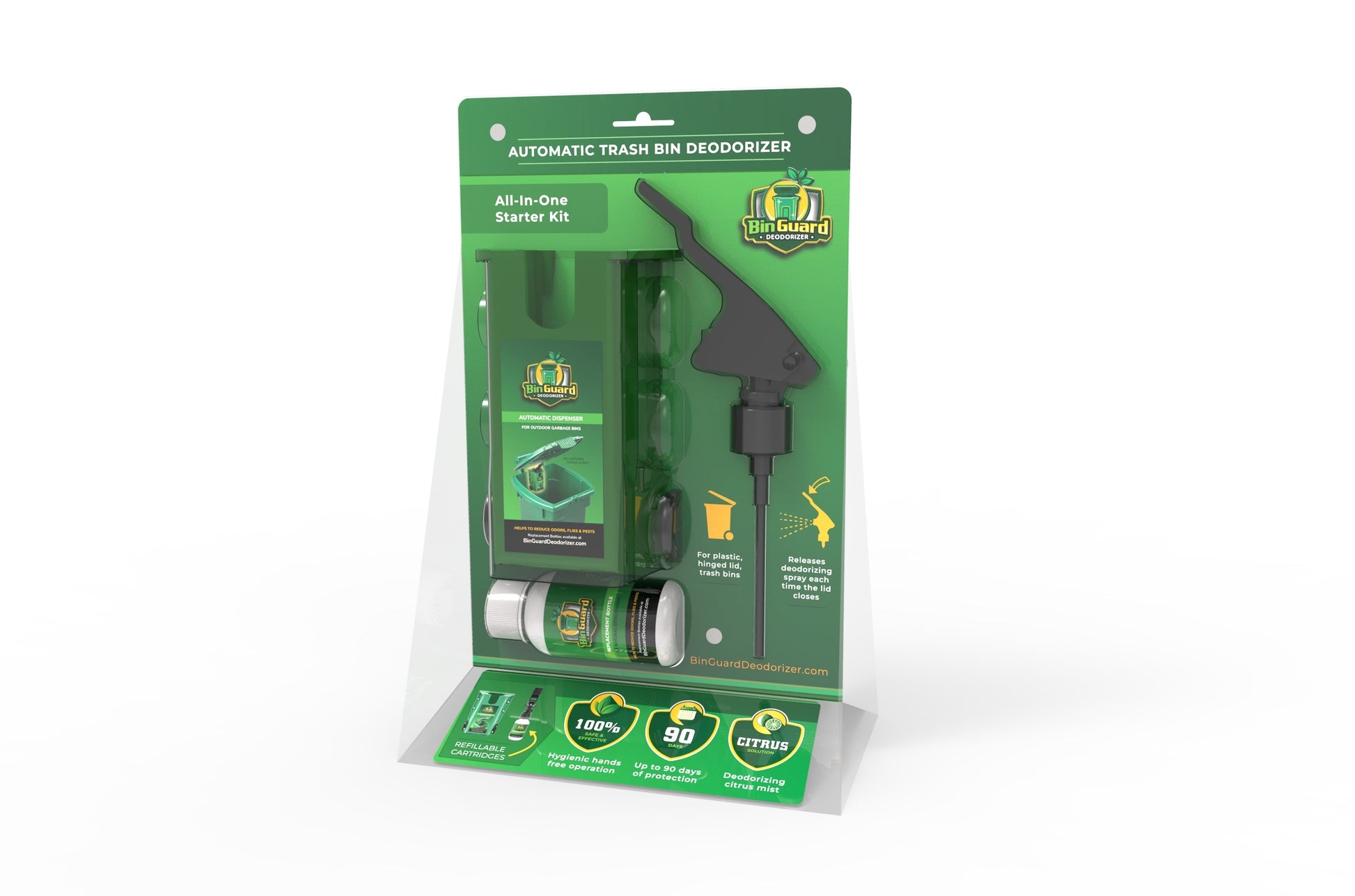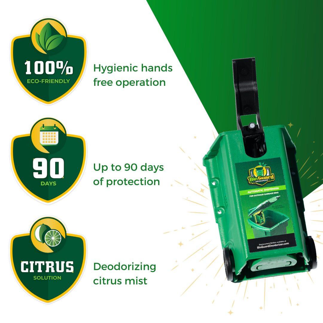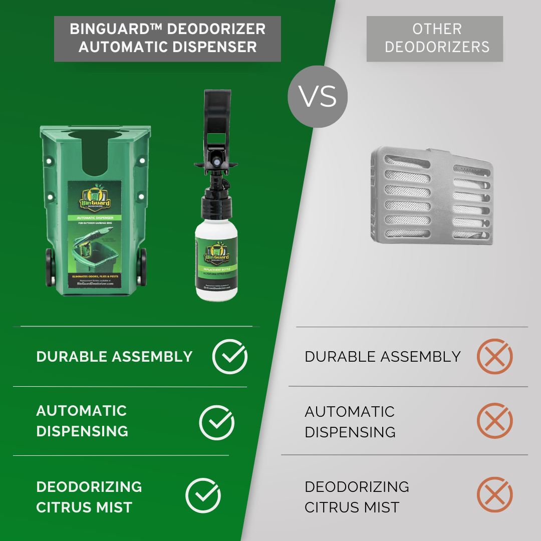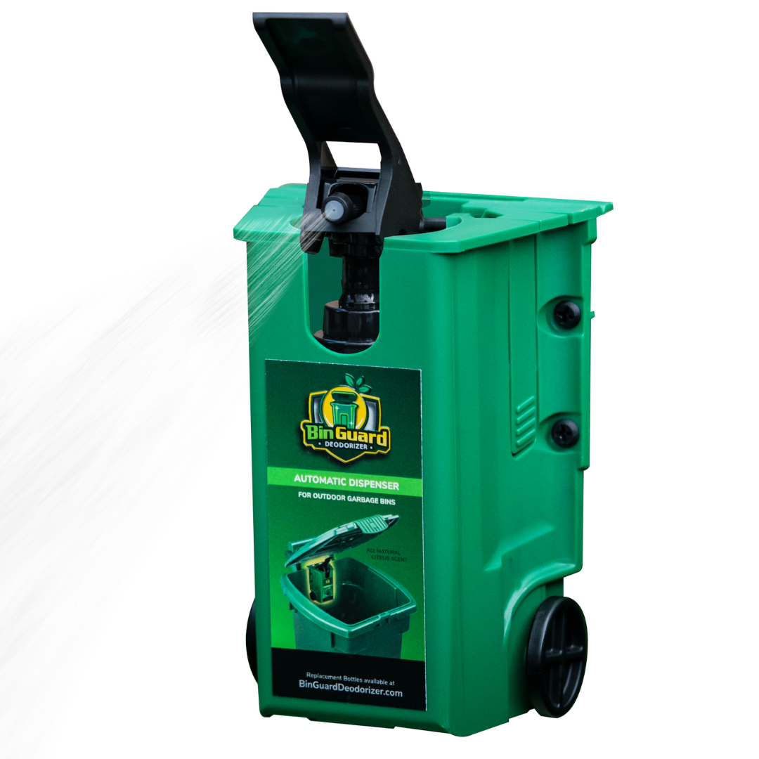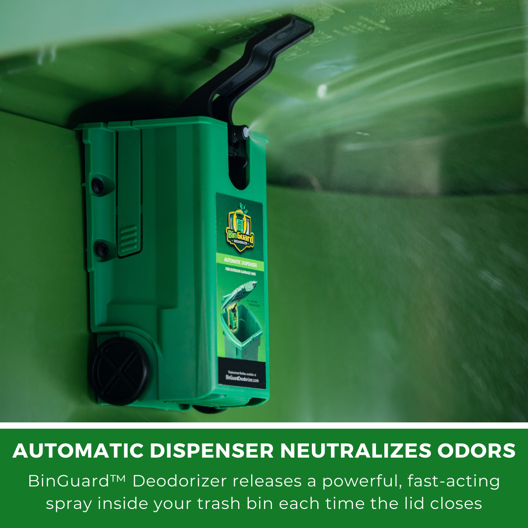 - The BinGuard Deodorizer Automatic Dispenser is built tough using automotive-grade nylon-infused plastic