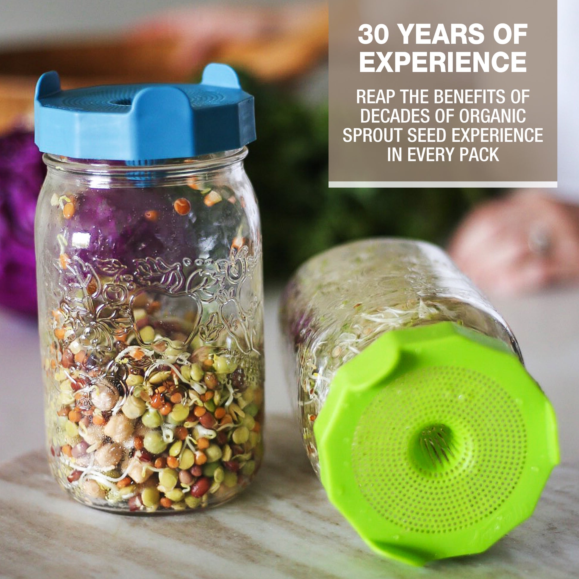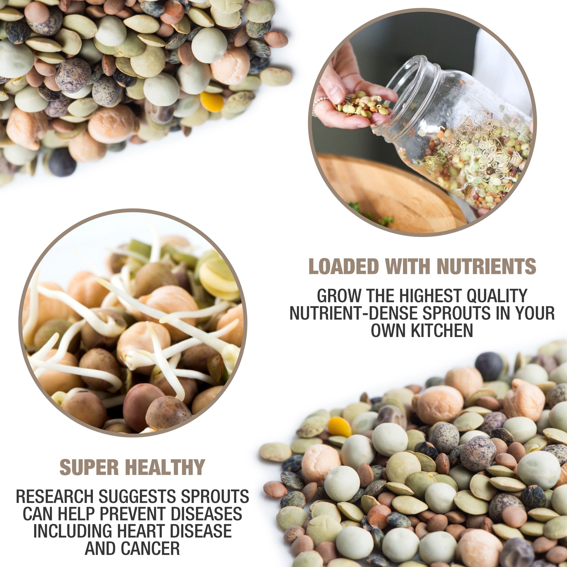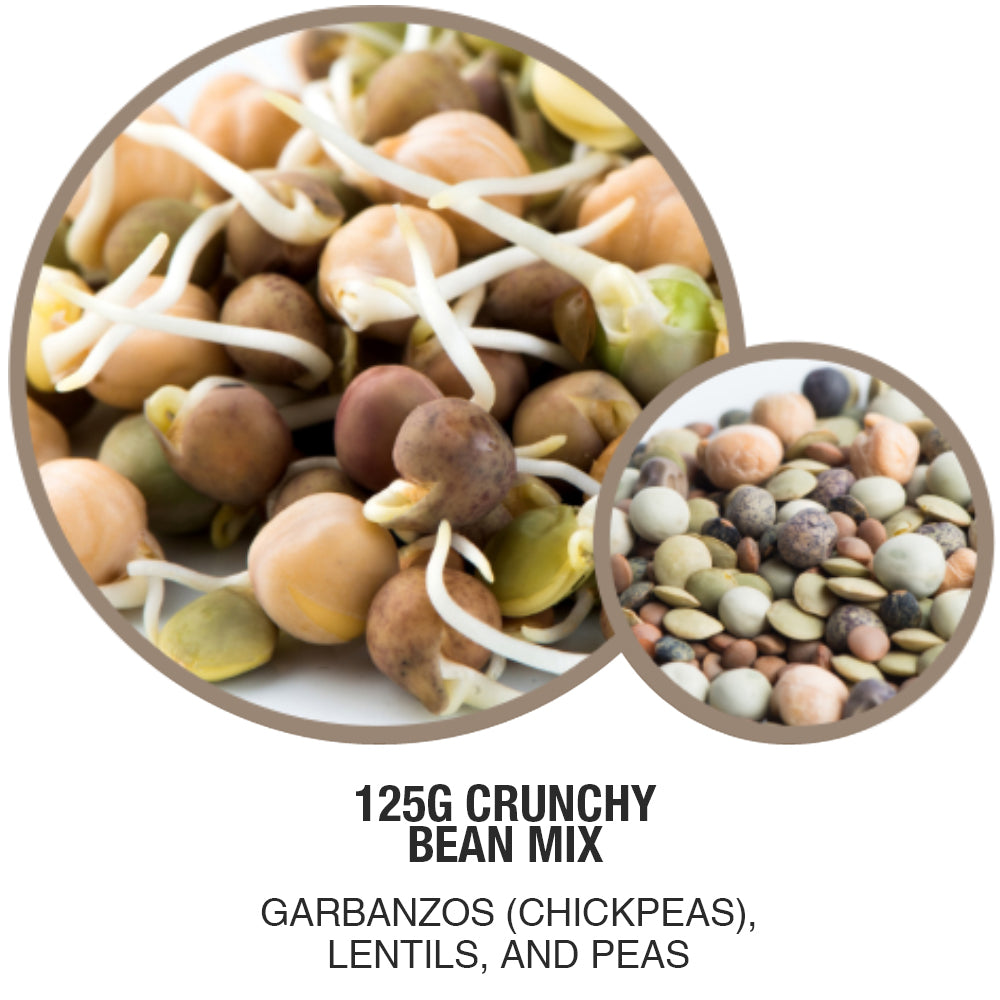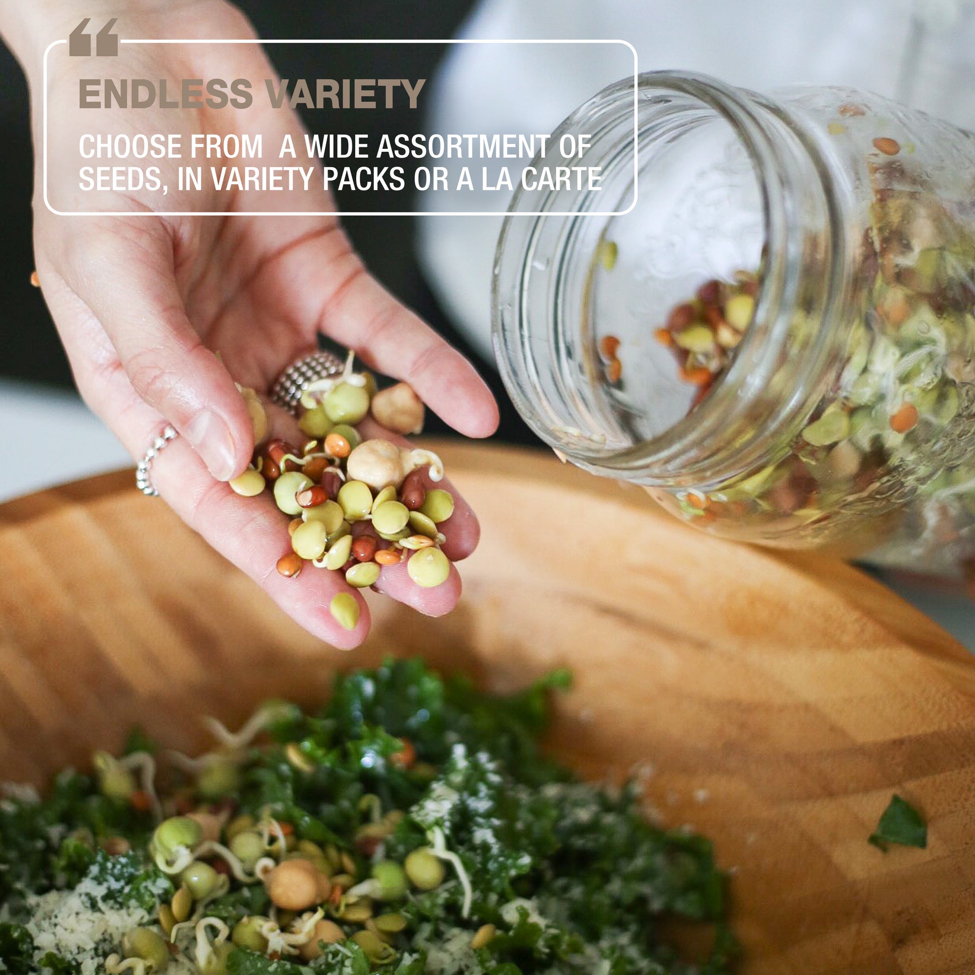 - Two Seed Options Available: (1) Crunchy Bean (chickpeas, lentils and peas) OR (2) Mumm's Sandwich Booster (clover, alfalfa, radish and mustard)